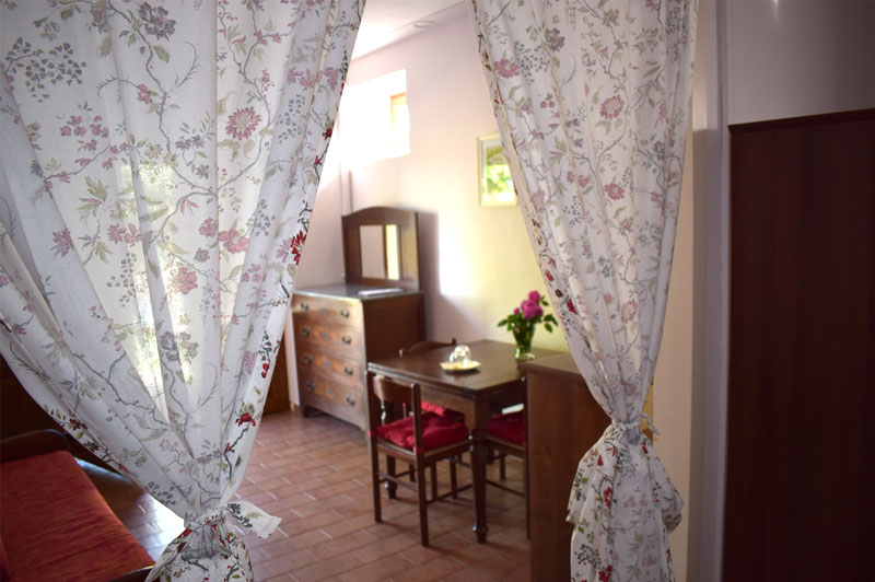 Our farmhouse has 5 rooms for a total of 10 beds. The rooms are all about 20 square meters and equipped with double bed, sofa bed, spacious bathroom with shower, satellite TV, small refrigerator, sitting corner and terrace with chairs and umbrella. The Italian breakfast with homemade jams is included in the price, children under 5 stay for free and on request we provide a cot.