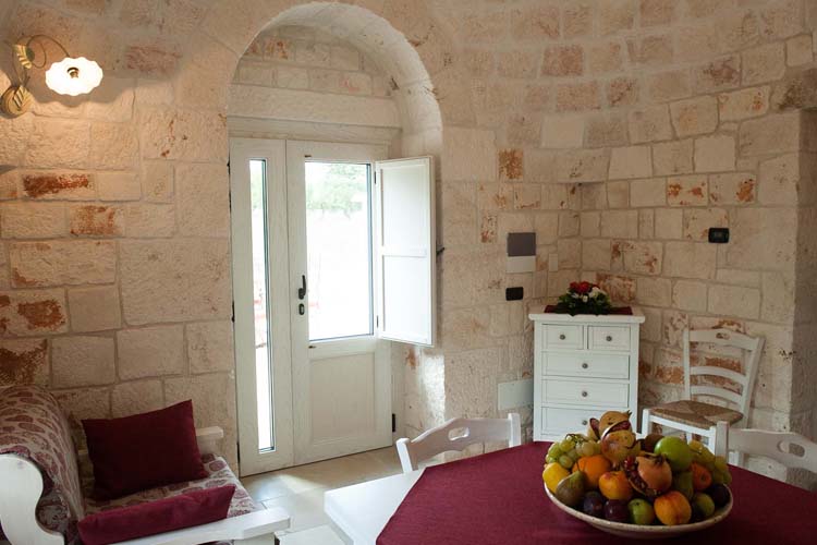 The customers of the farmhouse are hosted in trullo apartments renovated according to the ancient traditions of the trullar masters. Each apartment is elegantly furnished with poor art furniture and has one or two spacious and bright bedrooms, kitchen, large bathrooms and outdoor spaces equipped with tables, chairs and umbrellas. The apartments, all different from each other, have a kitchenette, dishes, bathroom and bedroom linen, satellite TV, DVD player, independent heating, mini bar, burglar alarm and hairdryer. The natural insulating characteristic of the Apulian rock allows to keep the houses cool during the summer and warm in the winter. To read the detailed description of the apartments click on the button.