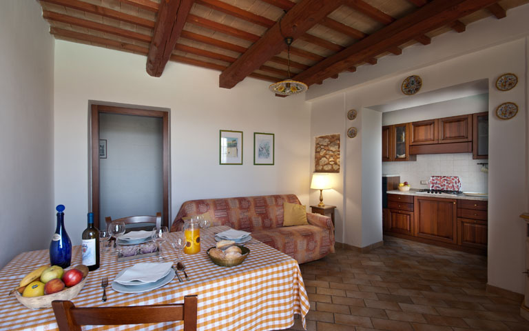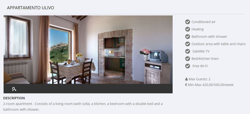 The farmhouse has four refined independent apartments equipped with satellite TV and heating. Each offers finishes and warm shades of the flower or plant from which they take their name. They cover 50 to 70 m2 and two of them have air conditioning. "Girasole" is a three-room apartment composed of a living room with sofa, kitchen, double bedroom, single bedroom and bathroom with shower. "Fiordaliso", "Ulivo" and "Ginestra" are two-room apartments consisting of a living room with sofa, kitchen, double bedroom and bathroom with shower. To read the detailed description of the apartments click on the button.